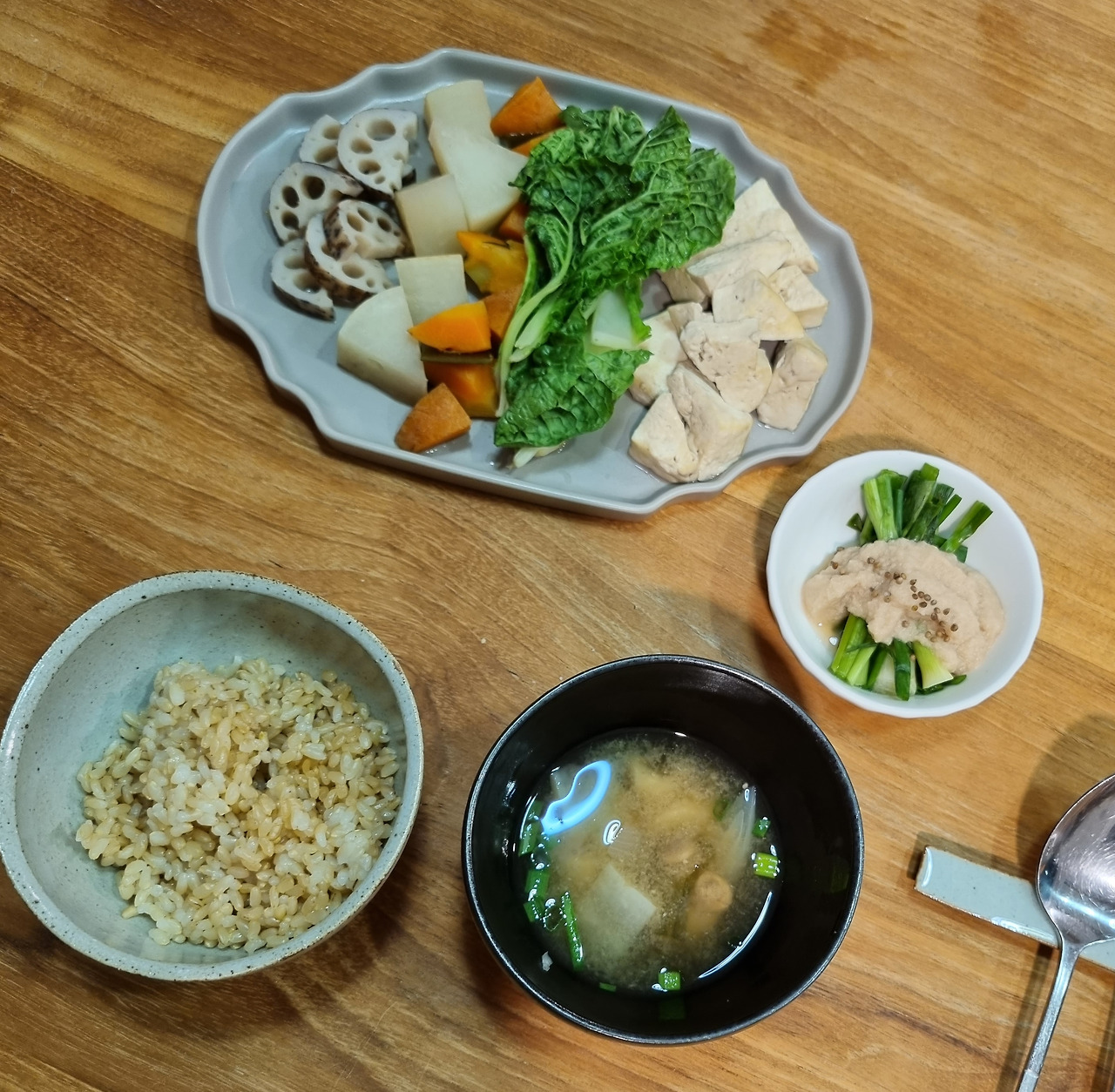 자극적인 음식에 익숙한 입맛이라면 처음 몇 번은 맛없다 느낄 수 있지만 입맛이 정화되는 과정을 기다릴 수만 있다면 채소가 알아서 만들어주는 이 고급진 맛을 누릴 수 있다. 하지만 내 가족들도 아직 그 과정이라는 핑계로, 나는 아직도 자주 현미 대신 오분도미로, 된장국 대신 김칫국이나 된장찌개로 타협을 한다.