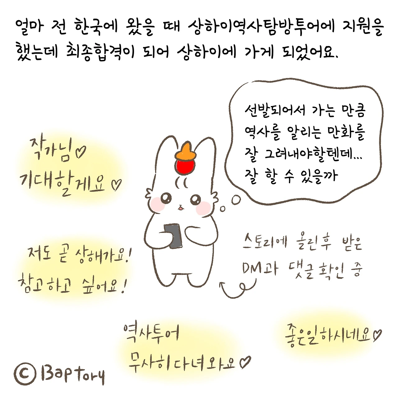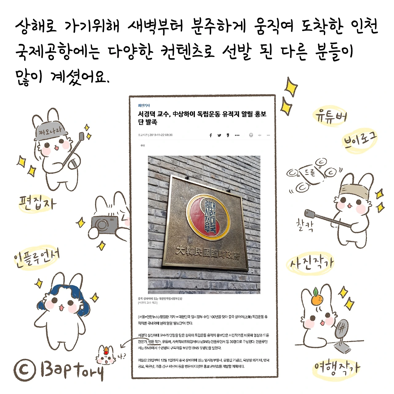 안녕하세요. 어제 상해에서 돌아왔어요. 많은 경험을 하고 온 만큼 조금이나마 독립운동에 대해 알릴 수 있는 기회를 얻어 너무 뿌듯한 2박3일 이었어요.