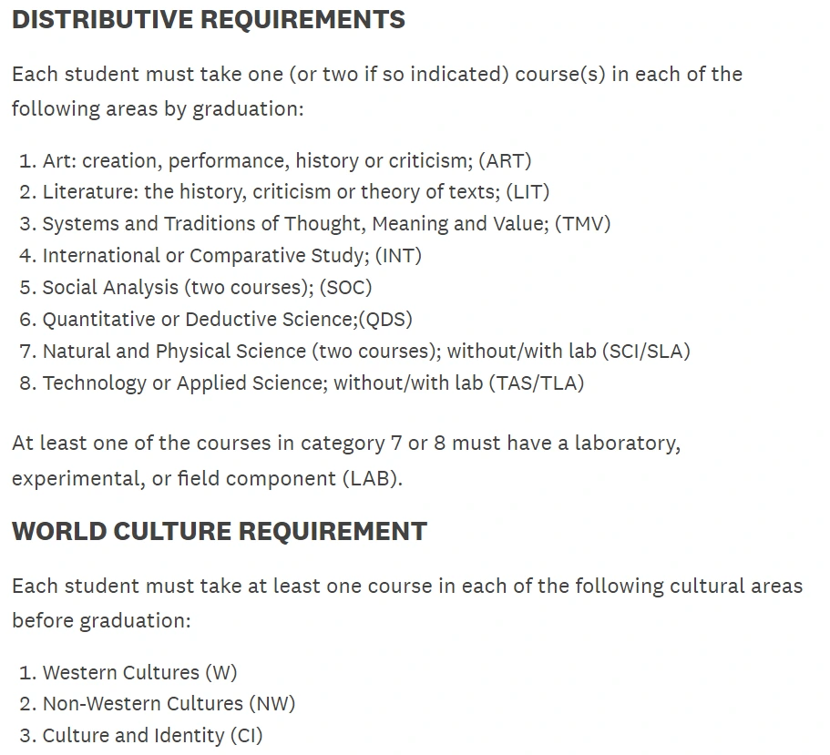 먼저 Distributive Requirement는 다양한 분야에서 의무적으로 들어야 하는 수업으로, 한국 대학으로 따지자면 일종의 교양과목이다. 다트머스의 모든 수업에는 분류 카테고리가 있는데, 학생들은 미술 (ART), 문학 (LIT), 종교 혹은 철학 (TMV), 국제학 혹은 비교학 (INT), 사회과학 (SOC), 수학 (QDS), 자연과학과 물리 (SCI/SLA), 기술 혹은 응용과학 (TAS/TLA) 이렇게 총 8개 카테고리에서 최소 하나씩 (사회과학은 두개)의 수업을 들어야 한다. 다트머스 학생들은 이 졸업요건을 줄여서 "디스트립"이라고 부른다.