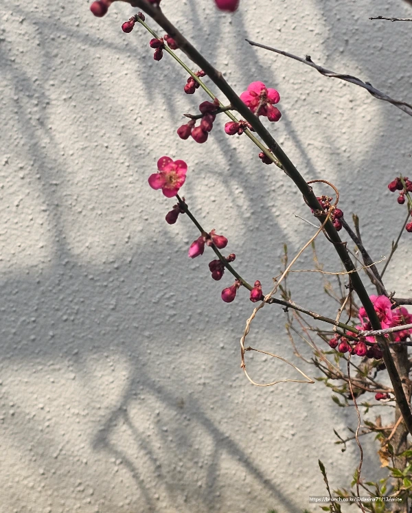 홍매화가 선 자리를 가만히 들여다봅니다. 홍매화는 벽에 기대어 서 있어, 봉오리에 머무는 햇살만큼이나 담벼락에 스며든 온기를 함께 나누어 가집니다. 오롯이 혼자 서 있는 청매화보다 담벼락의 온기가 더해진 홍매화가 더 빨리 꽃을 피웁니다.