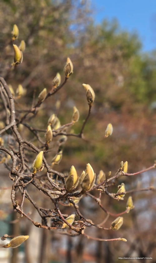 나는 목련의 기다림이 마치 기도처럼 느껴집니다. 겹겹이 쌓인 솜털 갑옷 안으로 여린 꽃잎을 품고 있는 모습은 마치 아이를 품는 엄마의 모습 같습니다.