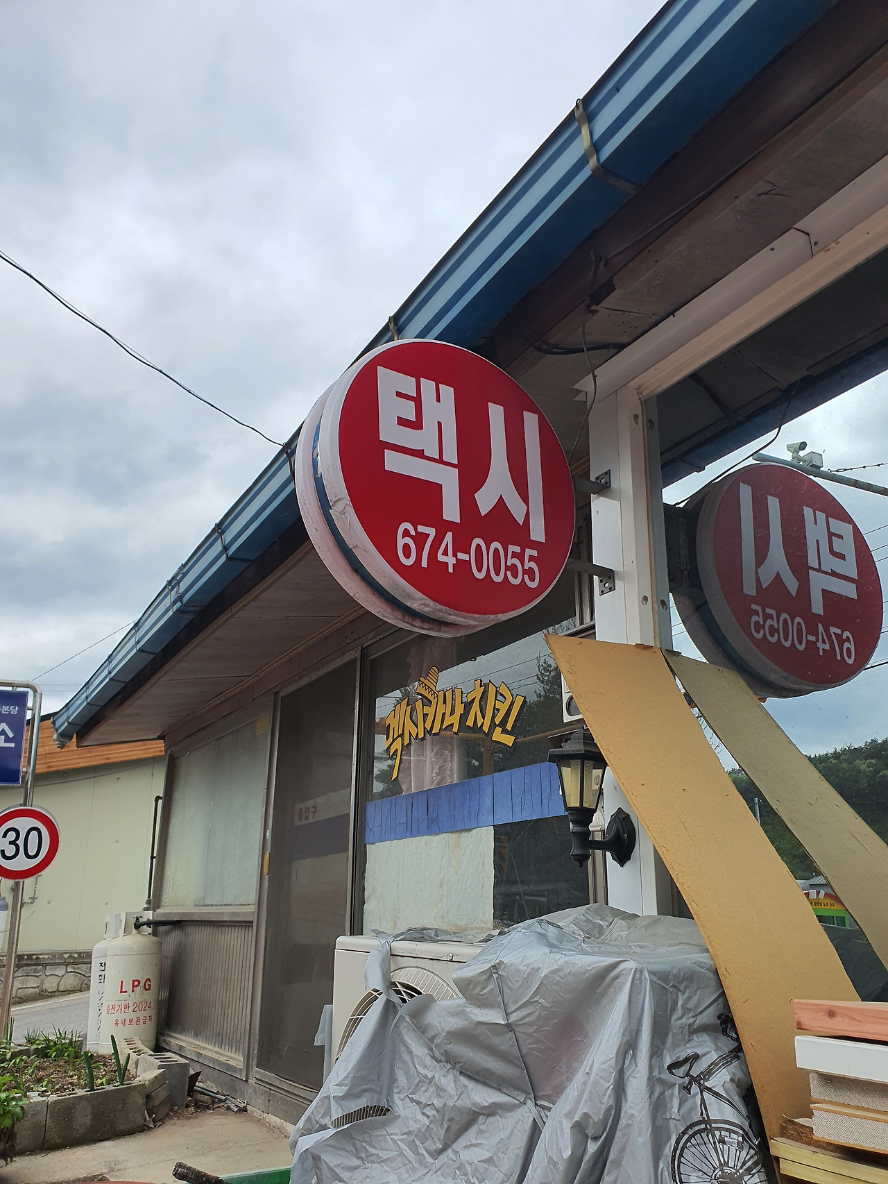 재선에 도착. 이제 청량산에 가려면 택시만 타면 되는 것이다. 거의 90% 성공. 버스 기사님은 바로 앞에 택시를 타면 된다고 하셨다. 내 눈엔 아무리 찾아봐도 택시가 없었다. 앞에 있단 말만 믿고 직진. 차는 없고 택시라고 쓰여 있는 작고 동그란 간판이 보였다. 태어나서 처음 보는 택시 간판. 간판 아래 전화번호가 있었다. 여긴 한 때, 치킨집이었나보다.