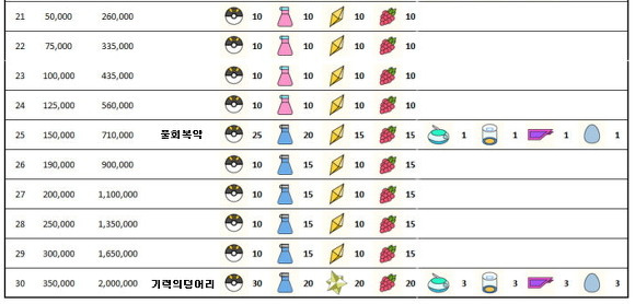 레벨 30 보상 아이템으로 하이퍼볼 30개, 풀회복약 20개, 기력의덩어리 20개, 라즈베리 20개, 향로 3개, 부화기 3개, 루어모듈 3개, 럭키에그 3개를 받았다.