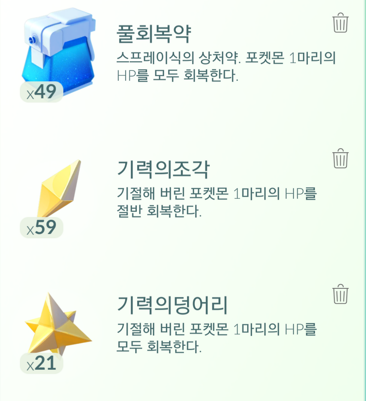 30단계에서는 '기력의덩어리'가 처음 등장했다. 기력의덩어리는 이전의 '기력의조각'이 2-3개 모여있는 형태로, 기력의조각 + 풀회복약의 기능을 한다. 나는 체육관 배틀보다는 도감채우기에 흥미가 있는 '수집형' 유저이므로 도구 가방이 부족할 때 기력의 덩어리 외 다른 포켓몬 치료용 아이템은 버려도 될 것 같다.
