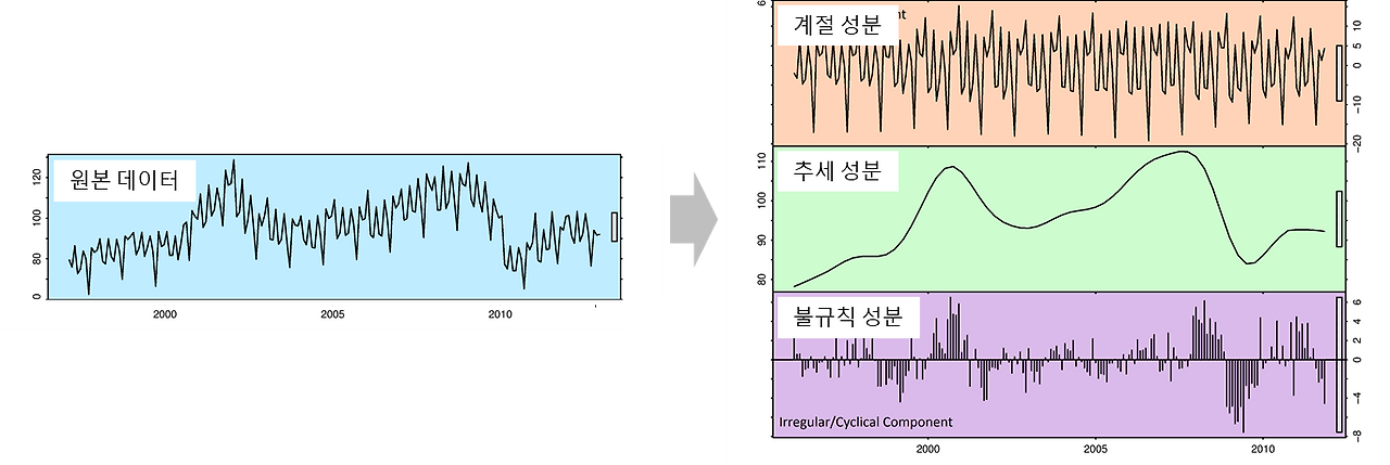 불규칙 성분 : 규칙성이 없이 우연적으로 발생하는 변동으로 추세변동, 계절변동 요인을 조정한 후에 나타나며 불규칙변동이 많이 존재하는 시계열자료에서는 신뢰성 있는 예측 어려움