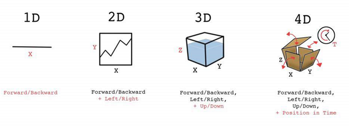 4번째 차원 : 시간은 세가지의 공간 차원과 함께 4번째 차원으로 인식됨