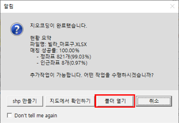 지오코딩이 완료되었다는 메시지가 나오면, '폴더 열기'를 클릭한다.