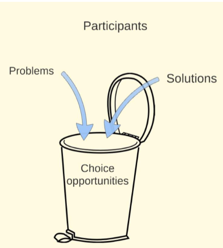 그런데 이 쓰레기통 모델이라는 것은 이것조차도 인정하지 않고, 더욱 극단으로 가서 인간은 합리적이지 않다는 것을 가정하고, 조직의 의사결정을 설명한다. 실제 예시를 한번 들어보면 고개를 끄덕이게 될지도 모르겠다.