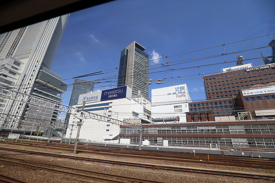 JR열차가 나고야역을 빠져나가면서 옆으로 보이는 메이테츠 백화점...
