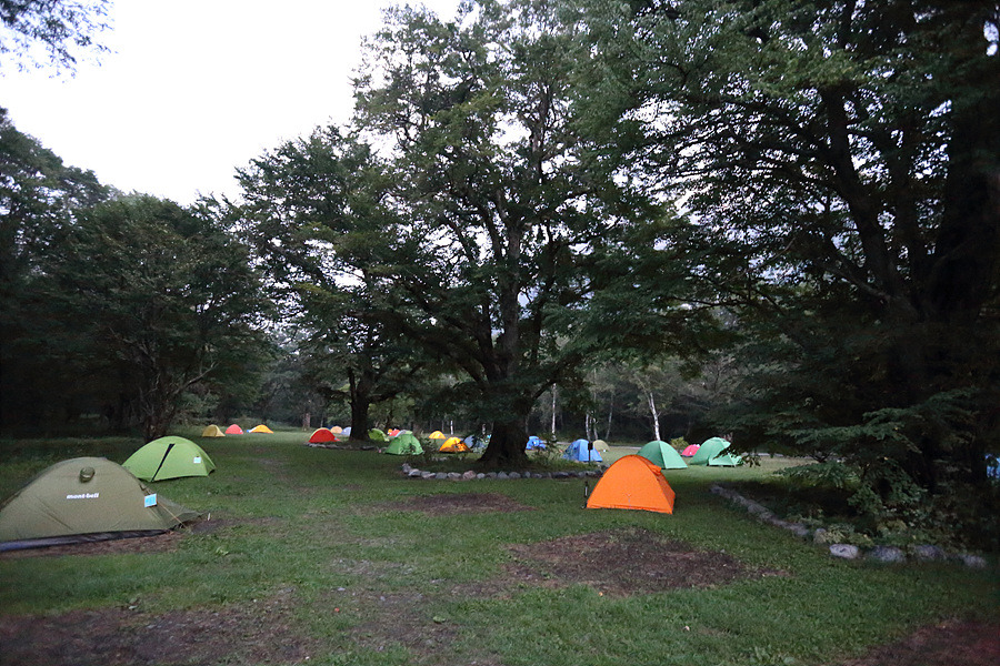 도쿠사와엔에서 한참이나 걸어와 텐트를 쳤던 것으로 느껴졌는데 아침에 일어나 확인하니 캠핑장 가장자리 끝 길 옆에 도쿠사와엔 바로 앞 아닌가? 우리네 정서에 맞게 그래도 난 잔디 위가 아닌 한쪽의 잔디가 없는 곳을 골라 숙영을 했는데 주변의 모습을 보고 약간의 후회가 밀려왔다.