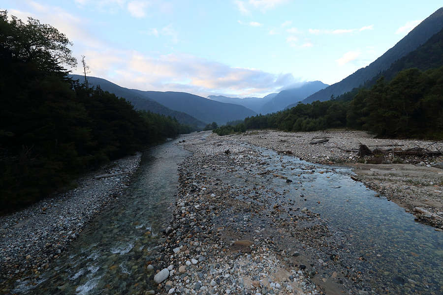 너무나도 깨끗한 계곡물이 다리 아래로 흐른다. 그리고 주변의 적막감 때문인지 얕아 보이는 계곡물의 소리는 요란하게 울려 퍼졌다. 그리고 펼쳐지는 주변의 병풍처럼 둘러싸여 펼쳐진 북알프스의 고봉들, 맑은 하늘...