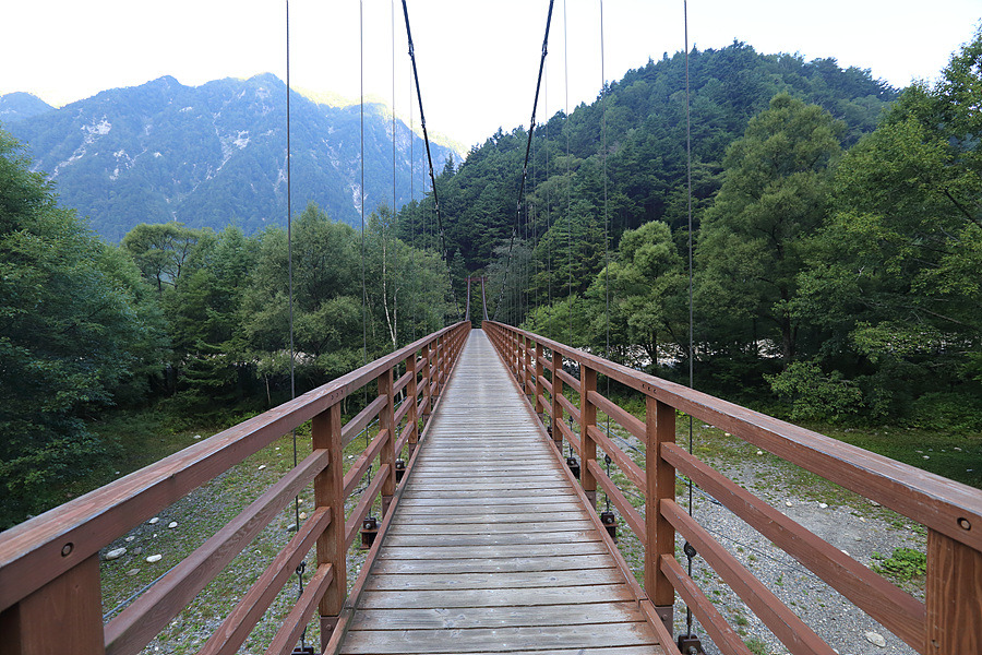 나는 호다카다케 연봉을 조금 더 가까이 보고 싶은 충동에 자연스레 다리에 올라섰다. 오히려 다리의 줄들이 시야를 방해한다. 아까 일본인들이 자리한 그곳이 이 모두를 전부 관람할 수 있는 자리였던 듯했다. 다시 다리를 건너와 요오코 산장으로 돌아왔다.