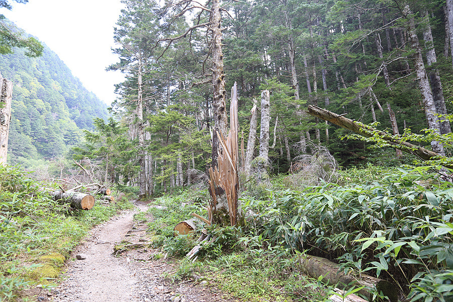 무엇 때문에 부러져진지는 모르겠으나, 굉장한 굵기의 거목이 등로옆으로 부러 저 있다. 그 사이사이로 인위적인 간벌의 흔적이 있는 것으로 보아, 안전 때문에 조치를 취한 듯보인다. 자연 그대로의 모습을 하고 있는 북알프스에서의 인위적인 모습이 오히려 조금 낯설게 느껴진다. 해살이 산머리를 돌아 땅에 내릴 때쯤엔 오전의 한기는 어디론가 사라지고 이 길을 걷고 있는 트레커에게 한낮의 열기처럼 느껴져 땀을 쏟아 낸다.
