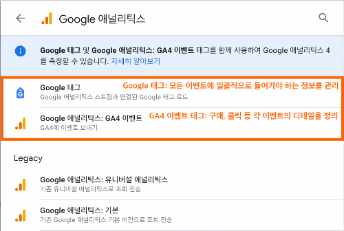 GA4 태그는 2가지 종류가 있습니다. 각각 Google 태그, GA4 이벤트 태그라고 부르는데요. 모든 이벤트에 일괄적으로 들어가야 하는 정보를 관리하는 것이 Google 태그, 그리고 각각의 구체적인 이벤트를 정의하는 것이 GA4 이벤트라고 이해하면 쉽습니다.