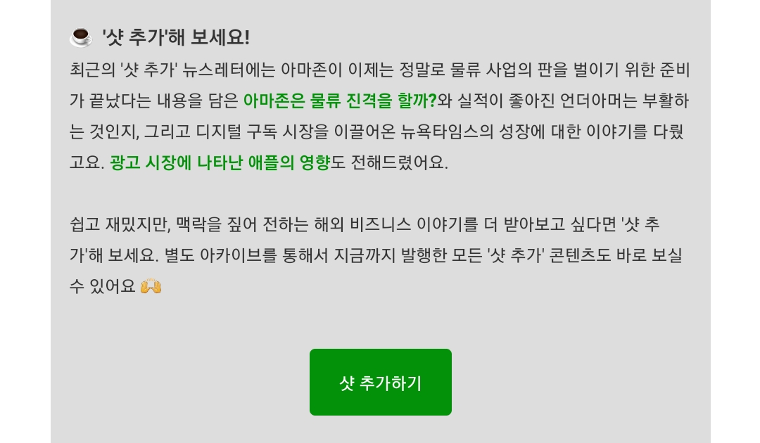 서비스가 계속 성장하기 위해서는 지속적으로 신규 유저 유입이 필요합니다. 현재 뉴닉 뉴스레터에는 공유하기 기능이 있긴 한데요. 직접적으로 구독자들에게 공유해보라는 식의 안내는 없습니다.
