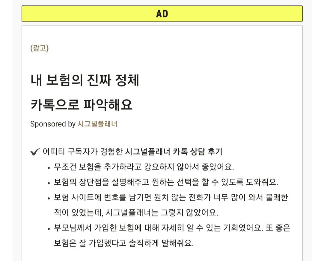 어피티, 캐릿, 뉴닉처럼 포괄적인 주제에 대하여 유익한 정보들을 쉽고 전달하는 방식의 뉴스레터들의 경우 그들이 가진 콘텐츠 소구력과 전달력을 활용하는 방식을 사용합니다. 광고들을 마치 뉴스레터의 한 섹션인 것처럼 자연스럽게 콘텐츠로 만들어 전달하는데요. 보는 사람들로 하여금 자연스럽게 광고 상품에 대한 정보를 습득할 수 있게끔 유도하는 방식(브랜디드 콘텐츠)을 사용하고 있어요.