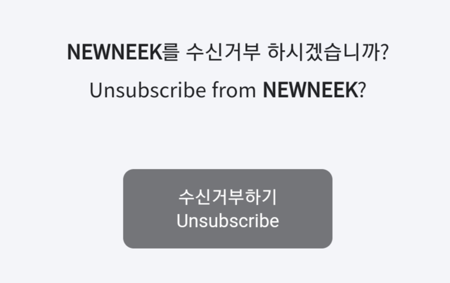 지금은 뉴닉 메일 최하단의 수신거부를 클릭하게 되면 'NEWNEEK를 수신거부 하시겠습니까?'라는 간단한 메시지와 함께 수신거부 버튼이 크게 보입니다. 이 페이지에 들어와서 최종 수신 거부를 하는 사람들의 컨버전을 확인해보고, 페이지의 구성, 워딩을 변경하여 최종적으로 수신 거부를 하는 사람들의 비율을 줄일 방법을 고민해보는 것도 좋을 것 같습니다.