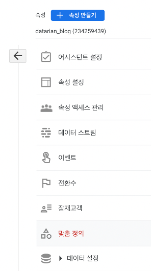 2. ‘속성’에서 ‘맞춤 정의’ 메뉴를 선택하고, 우상단 ‘맞춤 측정기준 만들기’ 버튼을 클릭합니다.