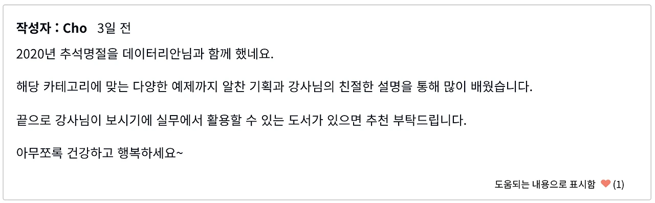 S: 이 책 저도 전에 Bomin님이 추천해줘서 샀어요. 위의 이유에 더해서, 마지막 장에 분석 리포팅에 대한 이야기도 좋았습니다. 분석만큼이나 리포팅을 잘하는 것도 중요한데 이에 대해서 독자가 생각해볼 수 있게 해 줘서 좋더라고요. 추천합니다.
