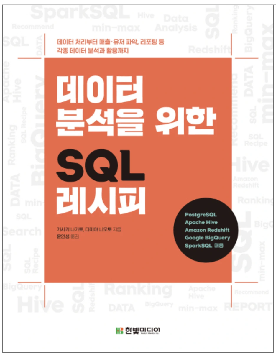 Bomin: 실무에서 바로 써먹을 수 있는 SQL 레시피입니다. 실제로 업무 할 때 참고가 되는 책이고요. 정형화된 테이블 데이터뿐만 아니라 회사에서 실제로 마주칠 수 있을만한 로그 데이터를 가공하여 추출하는 방법에 대해서 설명해주고 Google BigQuery, HiveQL, Presto 등 다양한 플랫폼에서 쿼리를 어떤 식으로 만들어야 하는지도 자세하게 나와 있습니다. 실제 현업에서 마주하는 요청사항들과 정말 유사한 예시가 많아서 참고가 되는 책입니다.