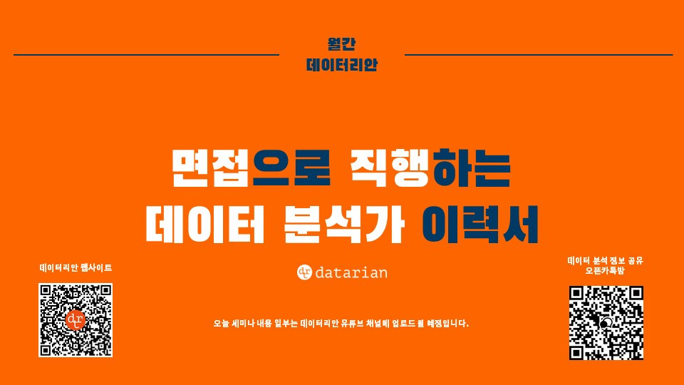 그래서 이제 무엇을 더 어떻게 해야 하는지 고민이 되던 차에 데이터리안 2월 세미나를 알게 되었습니다. 월간 데이터리안 2월 세미나에서 이야기 해주신 내용들을 토대로 이력서를 업데이트하고 지원을 해서 지금 회사에 입사를 하게 됐어요.
