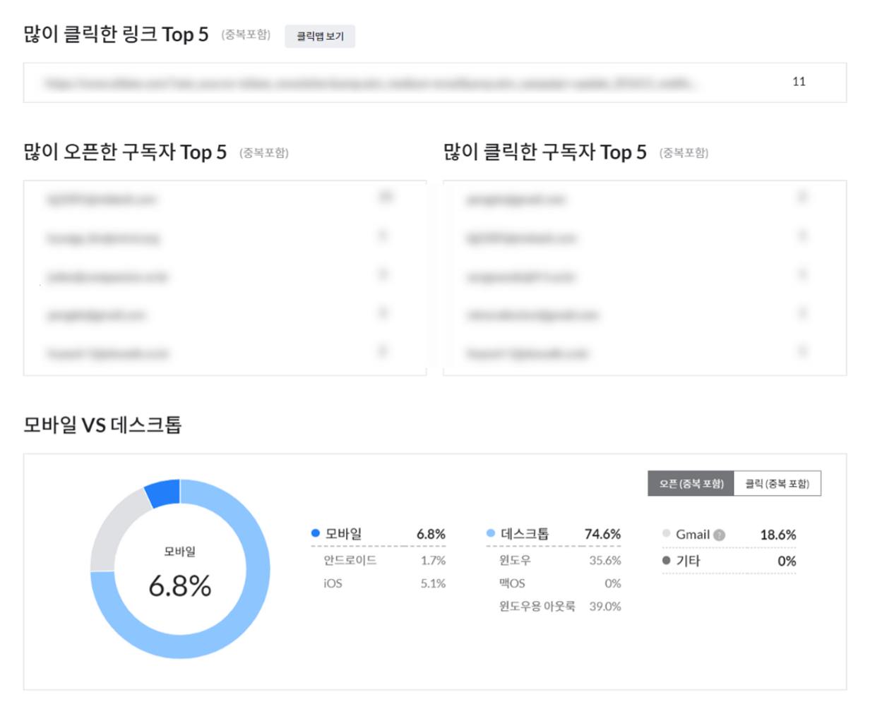 그 아래로는 구독자들이 많이 클릭한 상위 5개의 링크를 확인할 수 있습니다. 이번 뉴스레터에서는 구독자분들이 어떤 콘텐츠를 좋아하시는지 파악할 수 있죠. 그리고 어떤 분들이 뉴스레터를 많이 오픈하고 링크를 많이 클릭했는지도 확인할 수 있습니다.