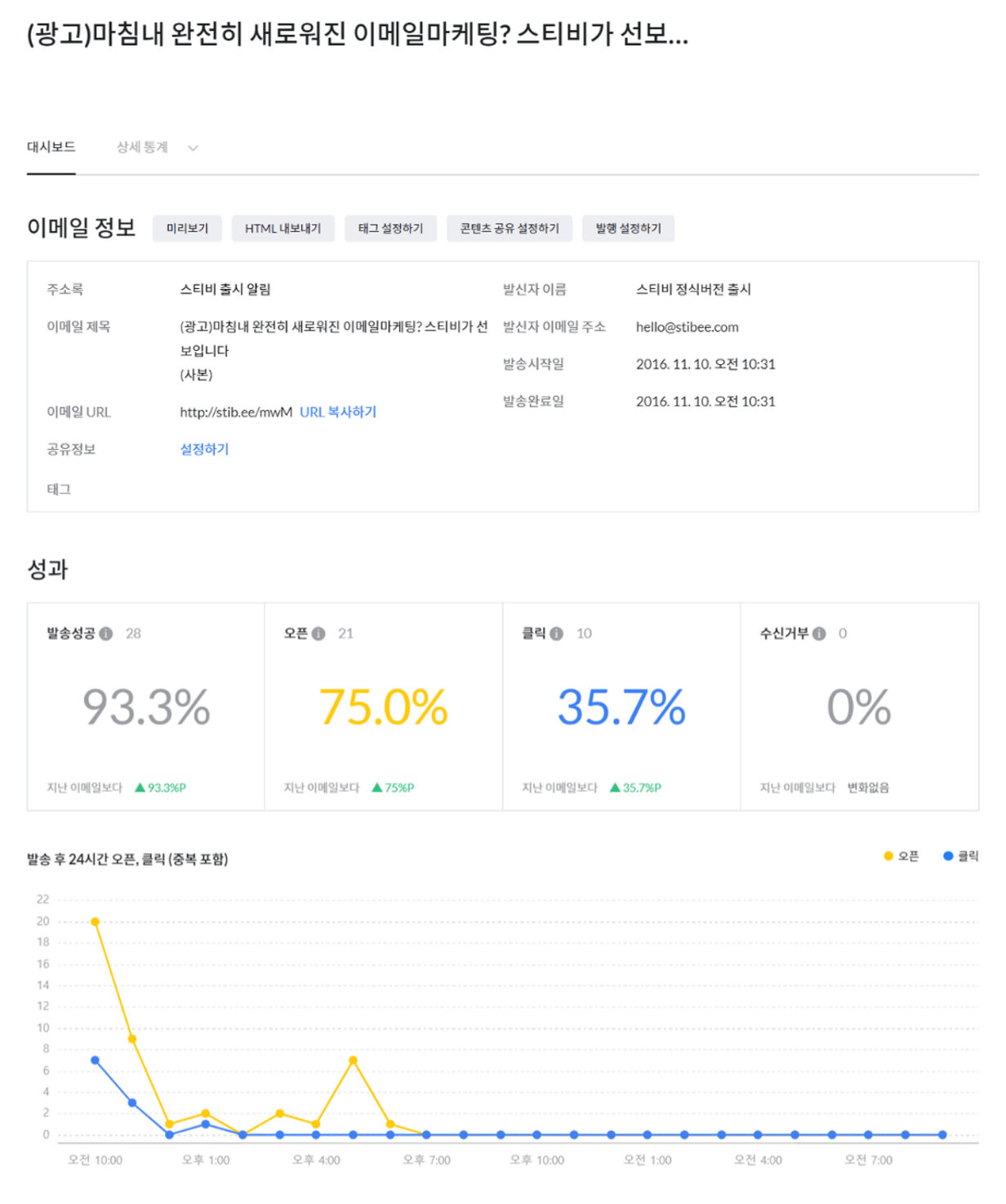 그 아래에는 발송 이후 24시간 동안의 오픈, 클릭 데이터를 시간대별로 확인할 수 있습니다. 발송 이후 어느 시간대에 오픈과 클릭이 많은지를 볼 수 있습니다.