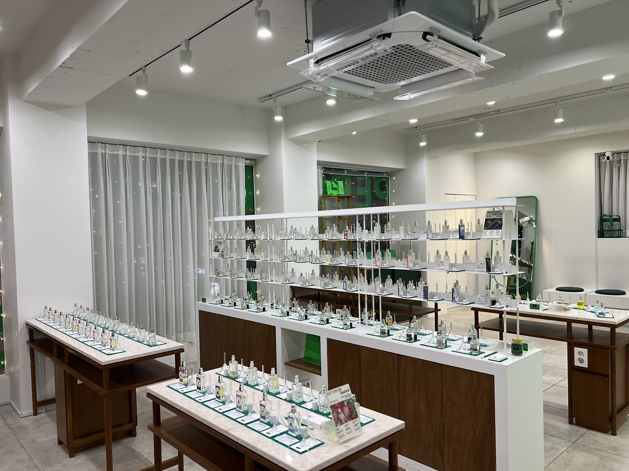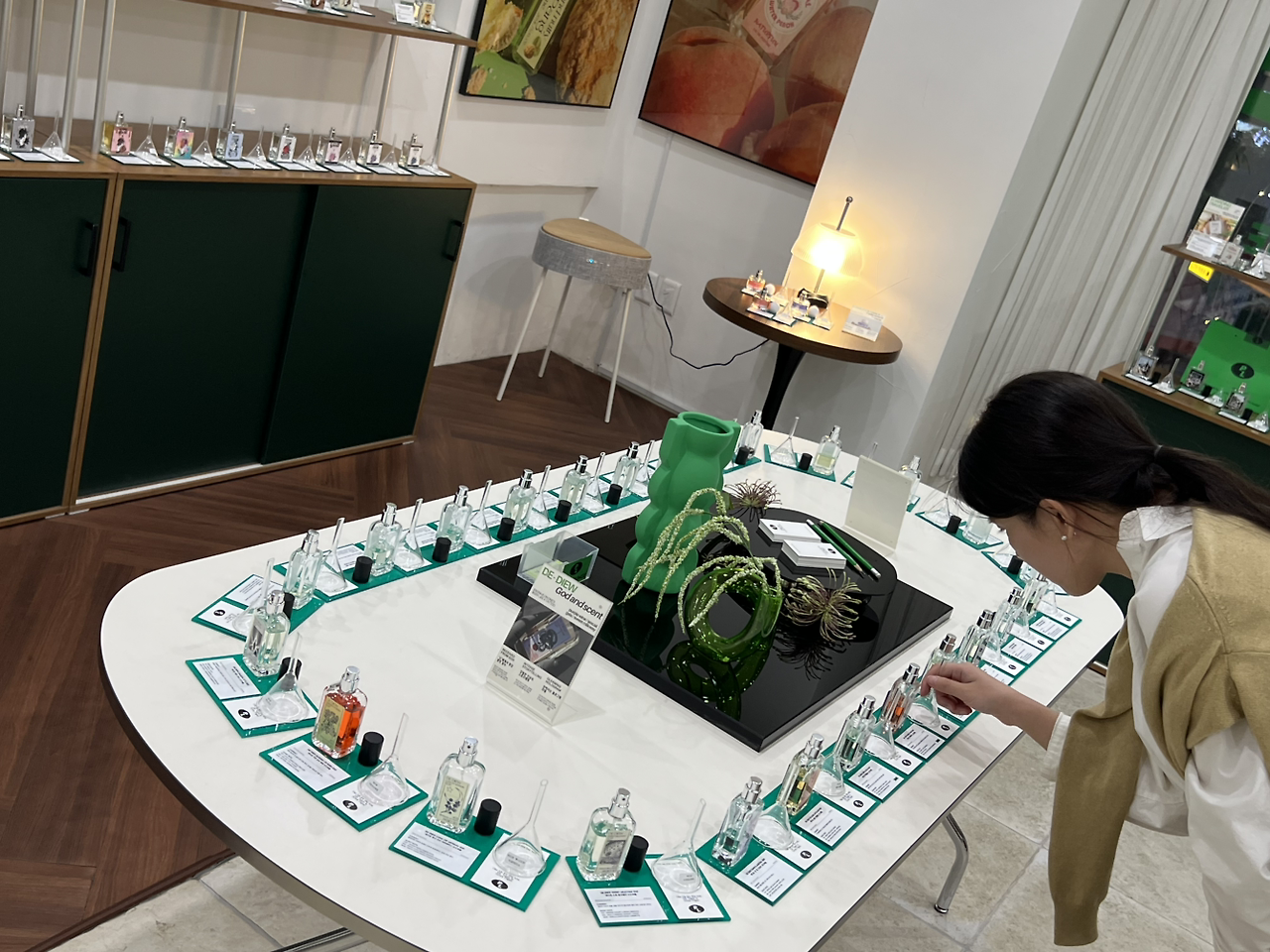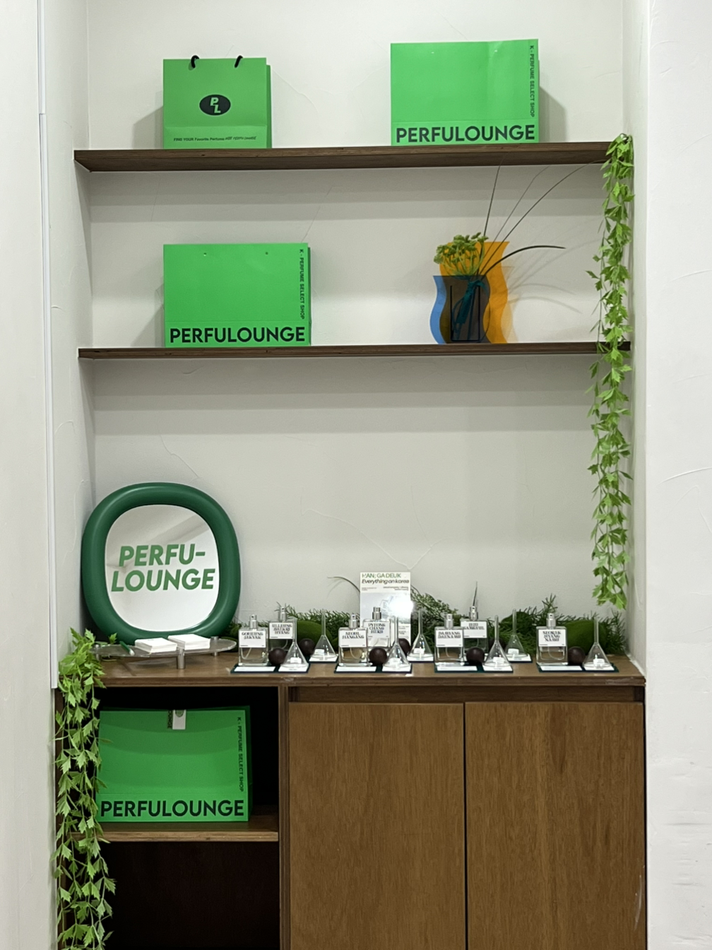 '퍼퓨라운지(Perfume Lounge)'. 그린 컬러 포인트와 새하얀 톤, 투명하고 청량한 향수병들이 줄지어 선 내부는 향수를 전시하는 공간이라기보다는 섬세한 감각 실험을 위한 랩(lab)과 같은 인상을 준다. 가볍고 밝은 인테리어지만 무겁게 다가오는 감각의 밀도가 있다. 단순히 향을 맡고 구입하는 쇼룸의 목적을 넘어선, 향의 경험을 깊고 오래 기억하도록 설계된 공간이다.