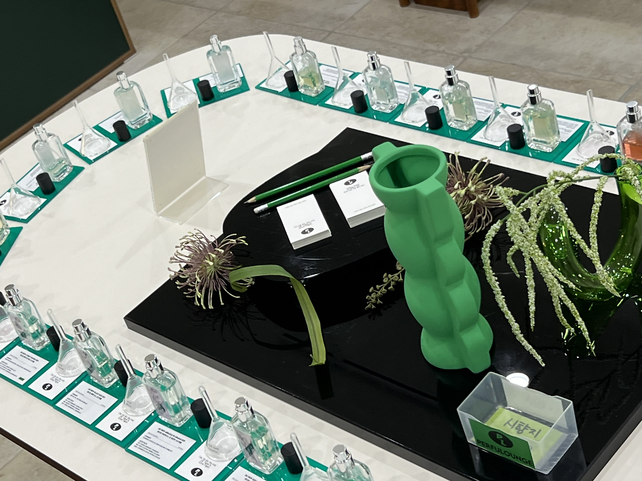 즉, 향기는 단지 ‘좋은 향’이나 ‘싫은 향’의 차원을 넘어, 인간의 무의식을 깊이 파고드는 비언어적 코드로 작동한다. 퍼퓨라운지는 이 점을 섬세하게 활용한다. 이곳의 향기 디자인은 단순히 좋은 냄새를 만드는 것이 아니라, 심상을 설계하는 일이다. 향수의 컨셉을 상징적으로 묘사한 설명 글귀와 함께, 향을 맡기 전에 심상으로 공간을 미리 구축하게 한다. 그 후에 맡는 향기는 우리의 예상과 교차하면서 무의식적 경험을 더욱 풍성하게 한다.