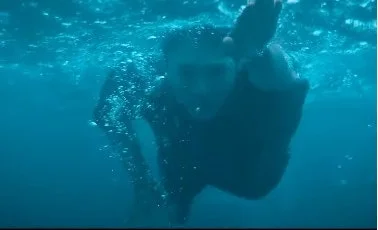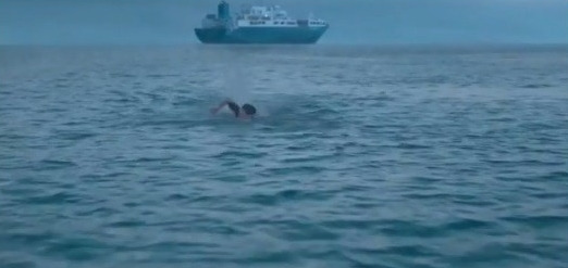 멀리 떠나간 대형 배에서 바다로 뛰어내리고,