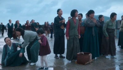 무언가 바다에 떨어지고, 부두의 사람들이 웅성댄다.