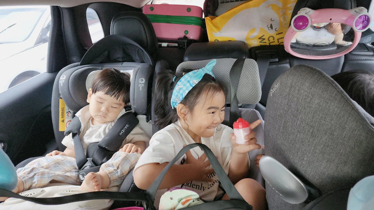 안 그래도 아이들이 타고 있어 운전에 긴장을 하고 있었는데 짐이 가득 있어 후방 시야확보가 어려웠다. 그리고 옆에 포박된 유라까지 신경이 곤두설 수밖에 없었다. 제주도를 누리기도 전에 나는 긴장과 먼저 마주했다. 그래도 다행이었던 건 비행기에서 낮잠을 자지 않았던 녀석들이 차에서는 아주 꿀잠을 주무셔 주셨다. 아이들이 시기 적절하게 자 줄 때 제일 고맙다. 제주도에 왔다고 드라이브 BGM은 태연의 제주도에 푸른 밤을 깔아줬다. 조심조심 운전해서 숙소에 도착했다.