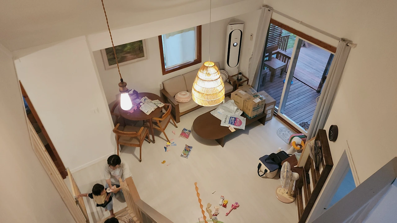 이 모든 과정 속에서 유라와 나는 자연스럽게 오랜 친구에서 가족이 되었다. 각종 비상상황을 뚝심 있게 헤쳐나가는 아빠의 역할은 나, 비상상황에서 아빠의 멘털이 나가지 않게 괜찮다고 그럴 수도 있지라며 정신적 지주의 엄마의 역할은 유라가 맡게 됐다. 효린이는 가족이 된 첫날이었지만 K장녀 모먼트를 살려 숙소에서 동생들을 잘 돌봤다. 여행 가기 전부터 두 동생들 잘 돌봐주기로 약속을 했었는데 첫날부터 잘 지켜주었다. 특히 2층으로 올라가는 계단에 무지 가팔랐다. 막 걷기 시작했던 돌쟁이 녀석들은 기어 다니기는 선수였다. 더구나 기어올라가기를 하기 위에 태어난 아이들처럼 계단을 보자마자 마구 달려들었다. 숙소 주인 분들도 기어올라가기 선수들이 온다는 것을 알고 계셨던 걸까? 숙소 계단에 걸쇠가 있는 문이 있는 거다. 계단 난간보다 깨끗한 상태의 나무로 말이다. 손님들이 맞이하면서 피드백을 반영하신 것 같았다. 아이들이 계단을 계속 올라가니 문을 제작해서 달아놓으신 듯했다. 그 계단의 문을 잘 닫아두는 것이 필요했다. 엄마인 유라이모가 아주 현명하게 효린이에게 임무를 부여했다. 아이 둘 보안관과 특별 임무로 계단 안전문 잘 잠가두기였다. 임무를 부여받은 효린이는 나를 닮아서였을까? 임무 수행을 찰떡같이 잘 해냈다. 각자의 임무부여가 명확해지면서 시작부터 글러먹었다 했던 마음이 조금씩 덜 글러먹어지고 있었다.