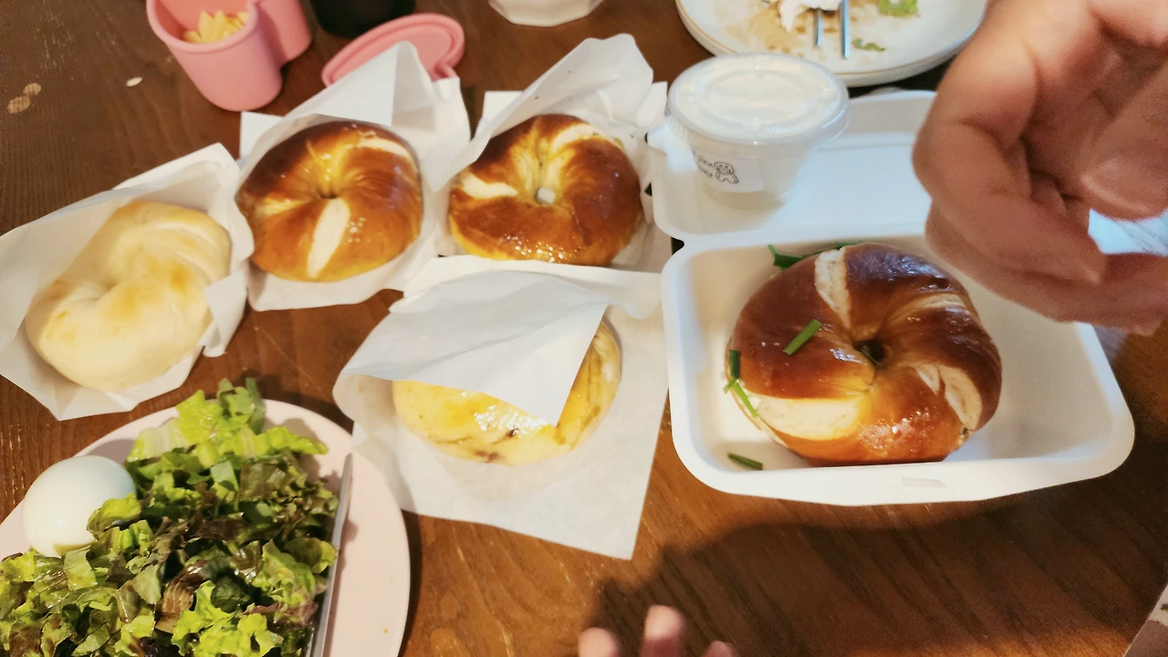 이 말을 왜 하냐면 제주도에 올 때도 아주 P스럽게 계획 없이 방문을 했다는 걸 일러두려는 것이다. 구조대 1팀인 유라의 가족이 온 다음 날 아침 나는 깜짝 놀랐다. 런던 베이글이 눈앞에 펼쳐진 거다. 아주 P인 나 조차도 제주도 런던베이글은 유명하다는 이야기를 들은 적이 있었던 터였고 그래서 한번 기회가 되면 먹어보면 좋겠다고 생각을 했는데 유라 남편이 포장을 해온 거다.