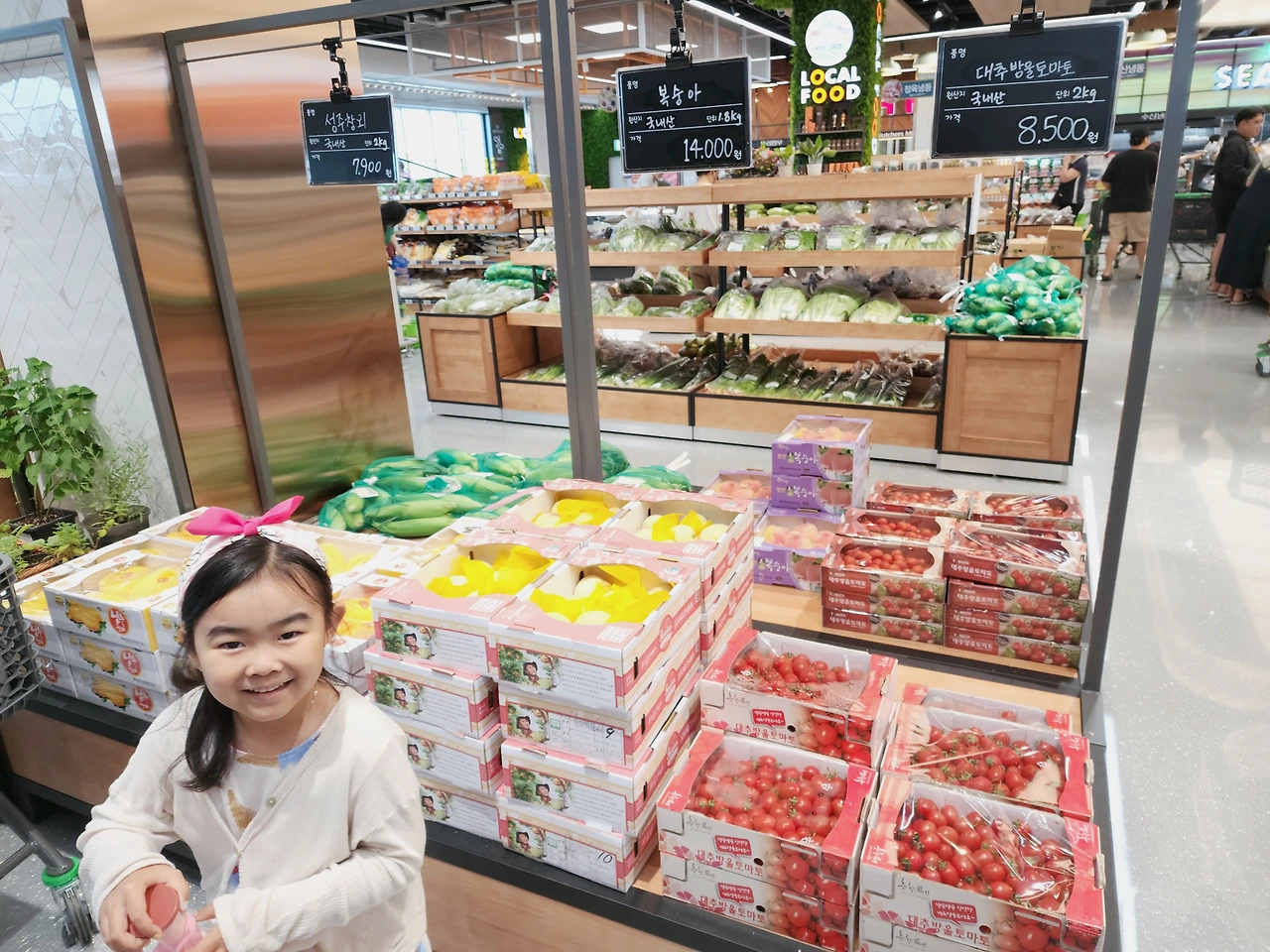 사실 구조대 1팀이 가고 바로 온 것은 아니다. 배웅하고 우리 셋은 숙소에 남겨졌다. 구조대 1팀과 유라, 서아만 함께 따라나선 거다. 구조대 1팀, 2팀 그리고 유라와 서아가 가족 완전체가 제주도를 잠시 함께 즐기다가 남겨지는 구조대와 떠나는 구조대로 바통터치 계획을 세웠던 거다. 그렇게 우리 셋은 숙소에 남아 청소도 하고 마당에서 곤충채집도 하며 숙소 주변을 탐색했다. 출출하기에 냉장고를 살펴보니 큰일이다. 먹을 게 없다. 구조대 2팀도 온다고 했는데! 하는 생각에 장을 보기로 했다. 첫날 공항에서 숙소로 들어오는 길에 보니 엄청 큰 하나로마트가 신규 오픈한다고 만국기 달고 행사하던 곳이 생각났다.
