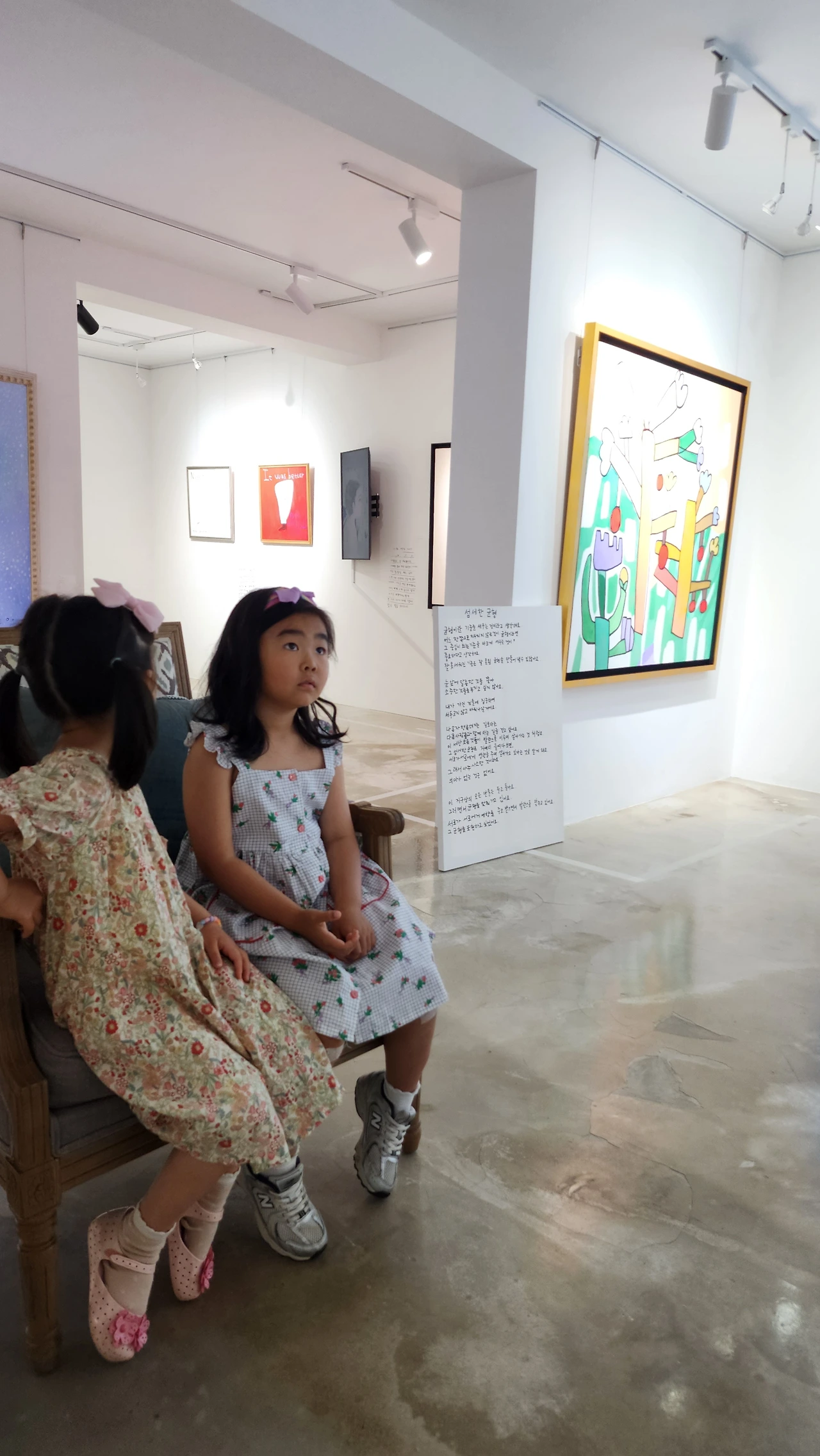 나한테도 그림을 좋아하는 효린이에게도 정말 많은 영감을 줄 수 있는 공간이었다. 그 공간에서도 효린이와 나은이는 이틀 전에 처음 본 사이가 맞는가 하는 정도로 꽁냥꽁냥 친하게 지냈다. 언니는 동생들에게 많은 것을 베푸셨다. 외식할 때 모든 비용을 다 지불하셨다. 그래서 나도 너무 보답하고 싶었다. 하지만 언니보다 어린 내가 나은이에게 용돈을 주는 것이 실례일 것 같았고 밥은 내가 산다고 말한 언니에게 내가 사겠다고 나서기도 애매했었다. 전희수 갤러리의 굿즈 샵에서 나은이에게 선물을 하기로 했다. 나은이에게 원하는 선물을 고르라고 했고 내가 결제를 했다. 이렇게나마 나에게 육아의 힘을 실어준 언니에게 보답을 한 것이다.