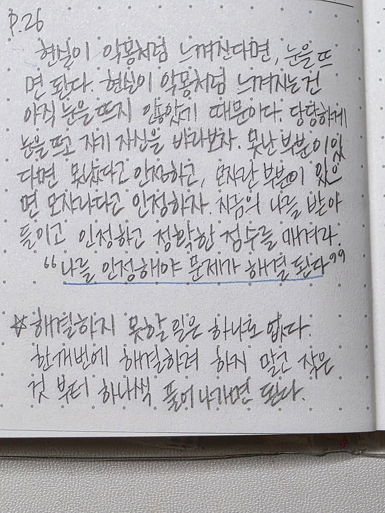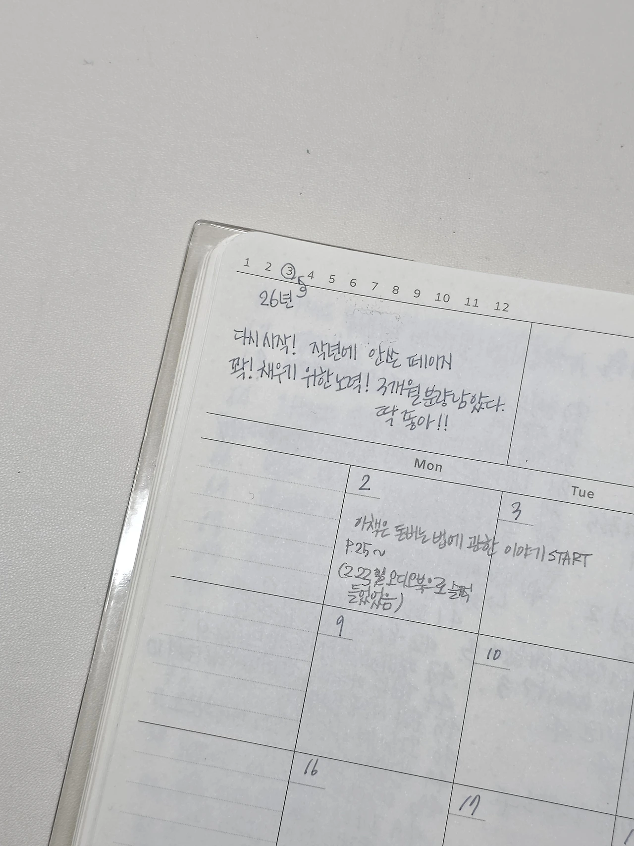펼쳤고. 썼다. 빈 공간이 시작되는 지점에 다시 시작! 을 썼다. 아날로그 기록쟁이들이 하는 말이 있다. 매년 1월 1일(신정) 일기 쓰기 다짐했다가 흐지부지 되면 구정에 다시 시작하면 되고 그마저도 되지 않으면 3월 새 학기 시작, 봄! 에 다시 시작하면 된다고 말한다. 그래서 나는 흐지부지 됐던 다짐을 2026년 세 번째 기회에 다시 시작해 보려 한다. 사실 시작은 특정 날에 정해진 것이 아니다. 내가 지금! 할 거야! 하고 시작하면 되는 것인데 타인이 정한 시간에 나를 끼워 맞추고 있진 않은지 생각해 보는 것도 필요하긴 하다. 그냥 지금! 언제든 나는 시작한다 하고 정한 시작이 나의 시작인 것이다. 사람마다 태어난 일시가 다르듯 사회에서 정한 시작은 편의에 의해 정해진 것일 뿐 나의 인생에 무언가를 하기 위한 시작을 맞출 필욘 없다고 본다. 그럼에도 세 번째 기회! 에 시작한다고 표현한 것은 혼자 시작하는 것보단 많은 사람들이 함께 시작한다! 하는 설렘이 가득한 시기에 시작을 하면 조금은 더 멀리 오래 나갈 수 있을 것 같은 마음 때문이다.