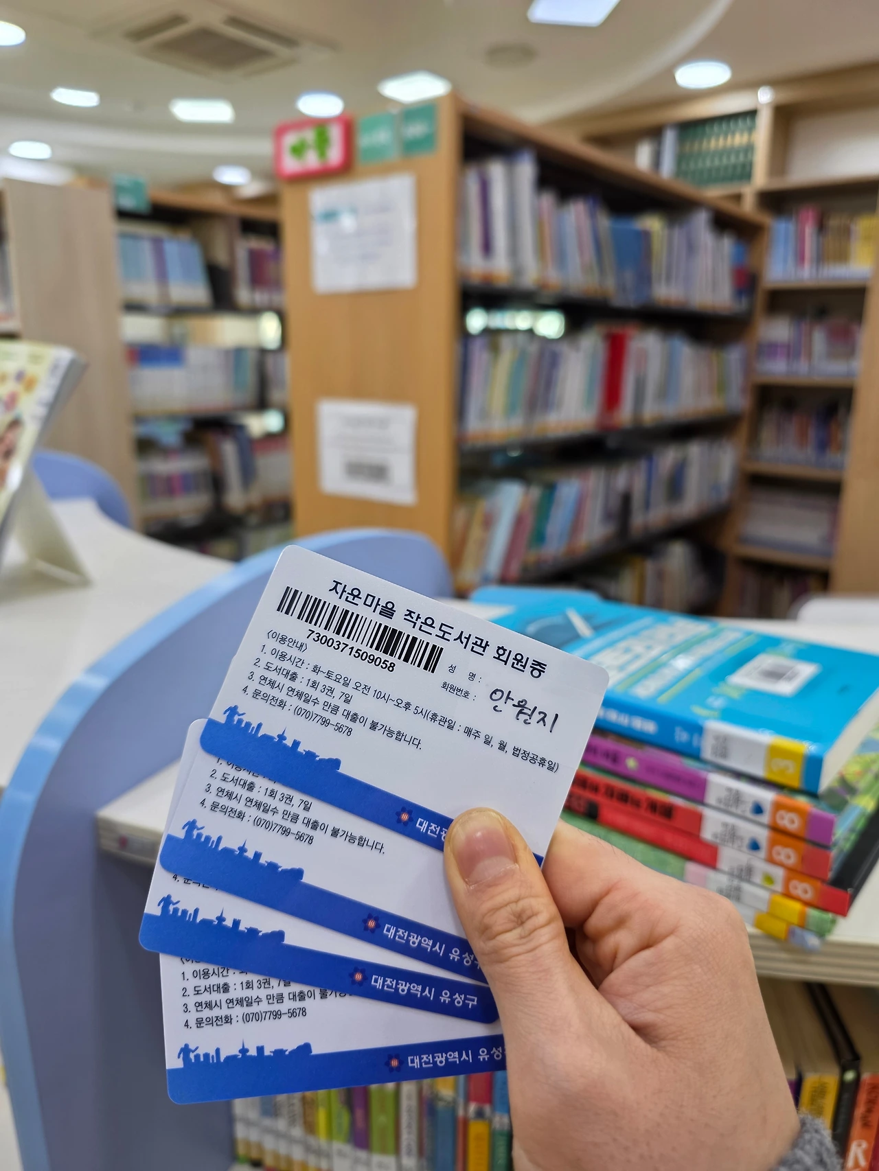 이사하고 근처 도서관으로 갔다. 도보권에 작은도서관이 있어서 온가족 회원증 만들고 책을 찾았으나 원하던 책은 없었고... 다른 책 한권을 빌렸다.