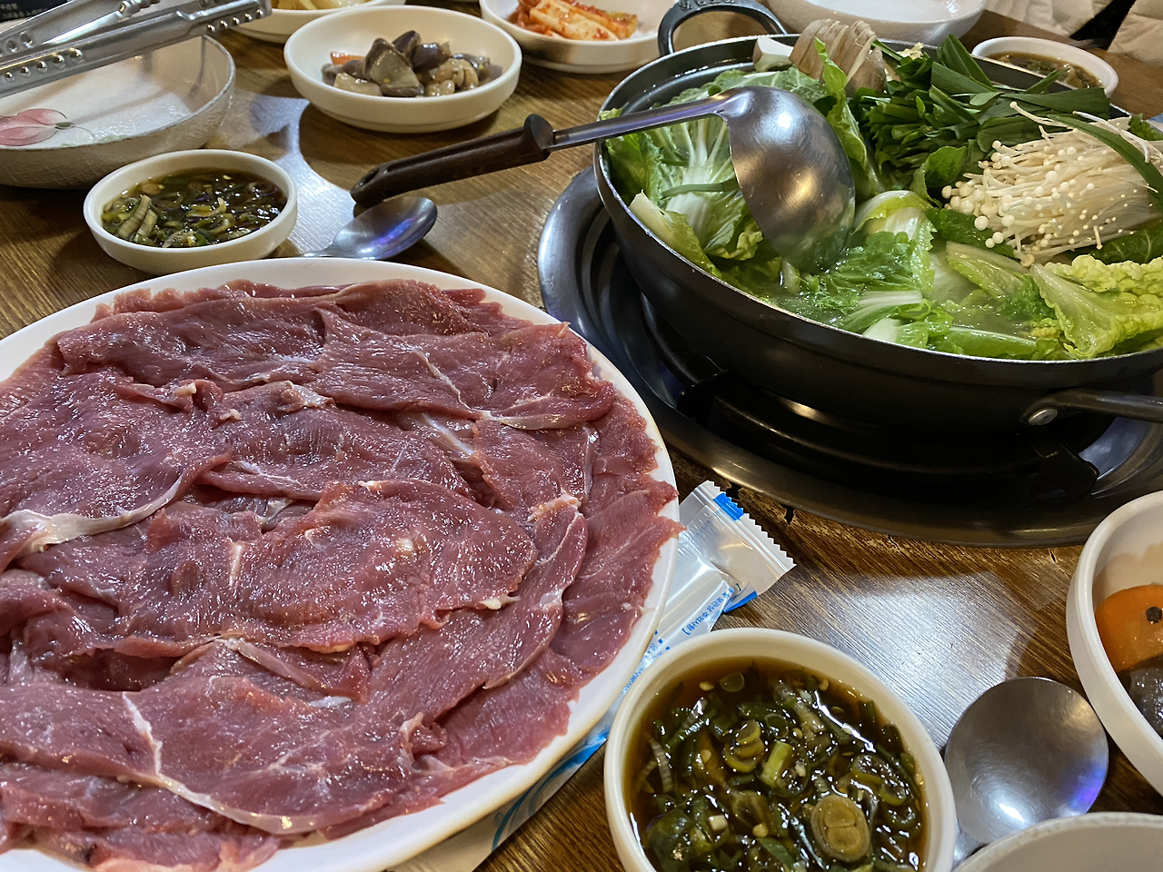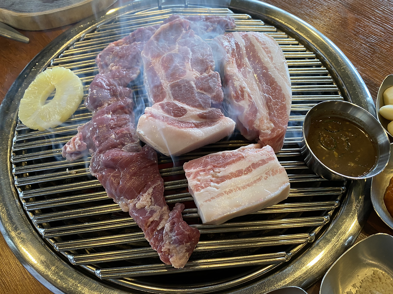 제주의 많고 많은 돈구이 식당 중 요즘 인기 있는 흑돼지 식당처럼 외관과 실내가 세련되지는 않아도 그렇기에 격식 없이 회포를 풀기에 제격인 장소를 소개한다. 물론 최상화 된 고기의 맛은 디폴트다. 제주의 상향평준화된 돼지구이 홍수 속 빛깔부터 다른 선도와 탄력 있는 육질로 질 좋은 돼지고기를 선사하는 이곳. 서귀포에서 드문 고기 구워주는 서비스까지 더해지니 가장 중요한 고기 흡입과 열을 올리게 하는 이야기에 흠뻑 빠져들 수 있다. 처음 방문했다면 인원보다 살짝 모자라게 모둠구이 2인 세트와 5인 세트로 여러 부위를 맛본 후, 입맛에 맞는 단품 부위를 추가해서 고기를 더욱 맛있게 즐기는 것을 추천한다. 고기의 느끼함을 해소시킬 수 있는 칼칼한 사이드 메뉴의 부재는 아쉽지만 고깃집에서 고기보다 더 중요한 건 없으니 패스.