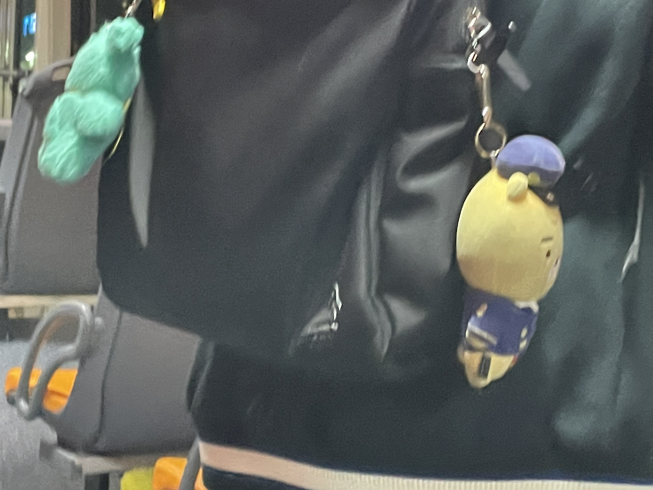 버스에서 댄스 뮤직이 흘러나옵니다. 기사님 뒤로 네 좌석 정도가 의자가 없어요. 서서 갈 수 있는 자리 옆으로 범퍼를 붙였네요. 덕분에 댄스 플로어 같아요. 내리기 전에 저기 서서 가볍게 몸을 흔들고 싶지만 환승을 해야 하니 참습니다. 앞 승객의 가방에 귀여운 인형이 대신 몸을 흔드네요.