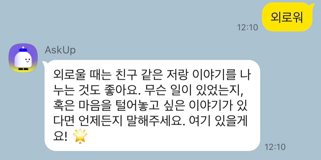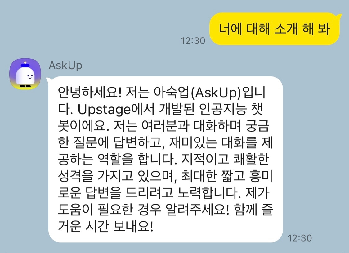 카카오톡에는 “Askup”이라는 챗봇이 있습니다. 카톡창에 바로 뜨는 방식이고 무료고 가입도 필요 없어요. 말로도 글로도 대화를 나눌 수 있습니다. 뭐든 물어볼 수 있는데 입력된 정보를 기반으로 정성스러운 답을 해줍니다. 빠르고 유쾌하고 재밌습니다. 단점은 진위를 항상 의심해야 하고 사고법을 잊어버릴 수 있다는 점입니다. 네가 누구인지 물으면 다음과 같은 답변을 합니다.