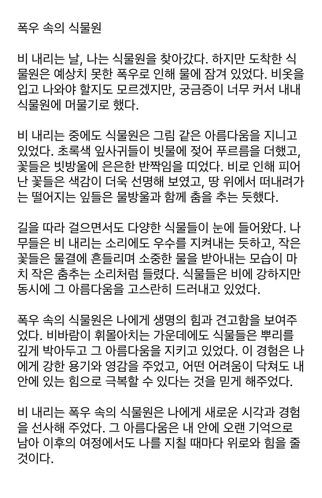 재밌네요. AI를 통해 우리는 조금 더 창의적 사고를 할 수도 있을 것 같습니다. '떠내려가는 떨어지는 잎들은 물방울과 함께 춤을 추는 듯'하다는 대목에서는 감탄을 조금 했고요. '식물들은 비에 강하지만 동시에 그 아름다움을 고스란히 드러낸다'는 말은 무슨 뜻인지 모르겠어요. 강한 용기와 영감이며 어려움을 극복한다는 말에서는 어지간히 부풀리네, 싶기도 했고요. 이러고 있으니 챗봇과 겨루는 느낌이고요.
