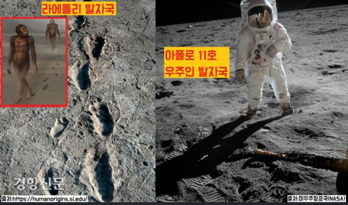 이 글의 마무리는 발자국 사진으로 할 생각이었다. 인류의 발자국 화석은 탄자니아 라에톨리(Laetoli)의 약 360만 년 전 지층에서 발견되었는데 두 사람이 나란히 걸어간 모습이다. 오스트랄로피테쿠스로 추정하는데 분출한 지 얼마 지나지 않은 화산 퇴적층 위에 두 발로 걸었음을 보여준다. 그것으로부터 달에 착륙한 암스트롱의 발자국까지 인간은 얼마나 멀리까지 뛰어오른 것일까,라고 하려 했으나 이미 그런 책이 있었다. (기사 속에 인용되었다) 한발 늦었네.