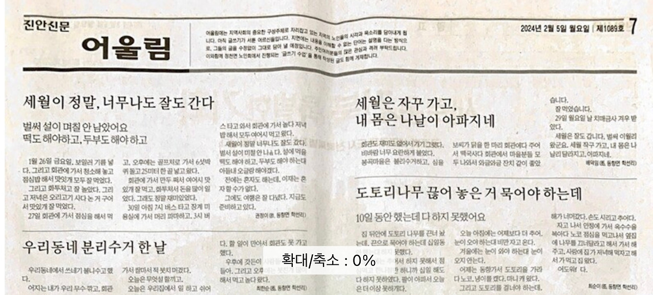 글을 모르시던 할머님들이 지역신문인 <진안신문> 글쓰기 수업을 통해 기자가 된 기사를 읽었어요. 창피함에 한두 줄 쓰기도 힘들었는데 이제 글을 통해 진안을 바꾸기 시작합니다. 오전 9시 반, 오후 4시 반 두 번 뿐이던 동향면 버스에 오후 2시 버스가 생긴 겁니다. 모두의 시간을, 인생을 벌어줬어요. 당시 정 씨 할머니는 "버스가 왜 사람을 안 태우고 가? 나뿐사람이지, 어찌 그럴수가 있을까?”라고 일갈하셨다고요. 할머니 멋지세요.