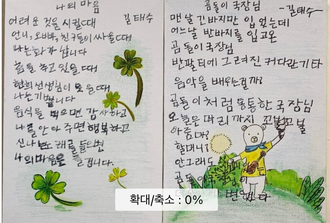 p.s. 사진은 할머님과 발달장애 어린이들의 글쓰기 수업 결과물입니다.