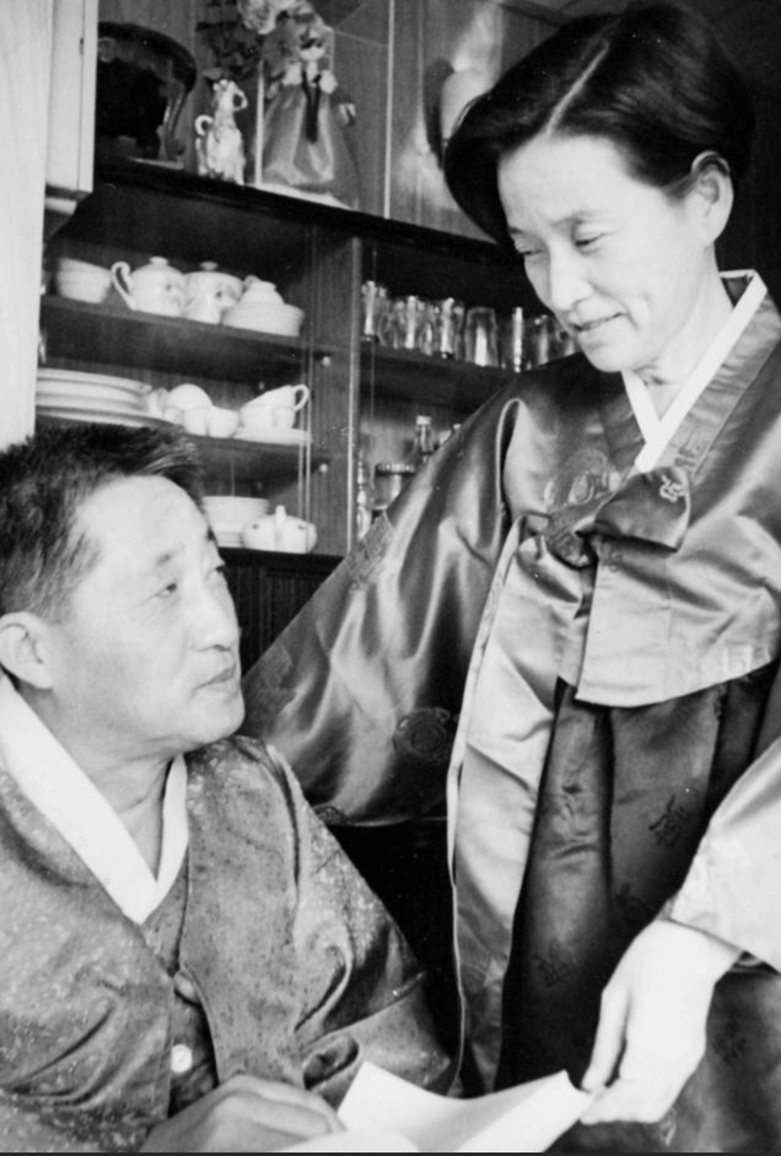 사진 속 두 분이 계신 공간은 거실 같습니다. 작고 둥근 소반과 한복을 입은 인형과 등 뒤의 아름다운 찻잔 세트와 유리잔들이 보입니다. 손님이 오시면 저 찻잔에 커피를 타서 내오셨겠어요. 원고지를 앞에 두고 글을 쓰실 때도 저 커피잔과 함께하셨을 것 같습니다. 인터뷰를 마친 기자가 사진 촬영을 부탁드렸겠지요. 아내 분은 싫다 하시다가 마지못해 한복으로 갈아입고 나오셨을까요. 겨울 한복 옷고름에 접어 보관하던 주름이 고스란합니다. 짧은 단발머리, 깊은 볼우물, 선한 눈매와 아련한 미소까지 아름답습니다. 사진기자는 포즈를 요청했겠지요. 박 선생님은 의자에 앉으시고 사모님은 책 끄트머리를 손끝으로 살짝 잡고 다른 손은 선생님의 등 뒤 의자에 얹어 보세요. 좋습니다. 서로 마주 보며 웃어 보세요. 아주 좋습니다, 찰칵!