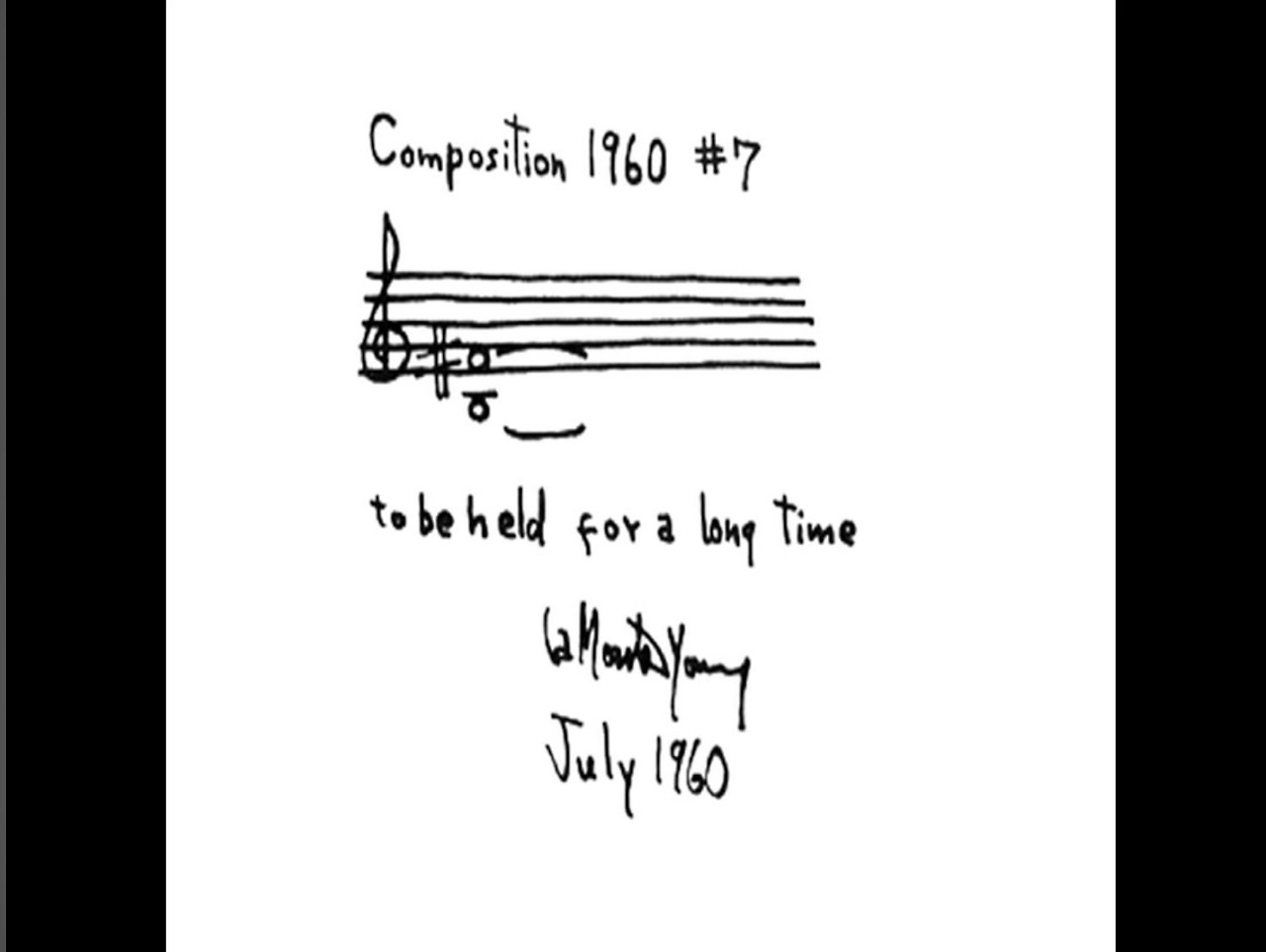 La Monte Young의 Composition 1960 # 6은 시(B)와 파# 의 완전 5도로 이루어진 화음을 오랫동안 유지할 것을 요구합니다. 악보가 끝나지 않아요. 열려 있습니다. 오래 유지할 수 있어요. 얼마나 오래인가, 하는 점이 관건이지요. 종이 한 장은 느끼지도 못할 정도로 가볍지만 그것을 오랫동안 들고 있는다면 천 금 이상이 되니까요. 그는 이렇게 말합니다.