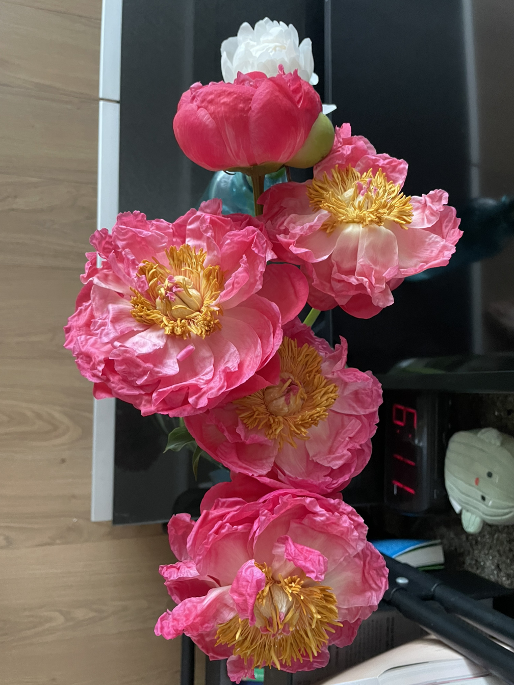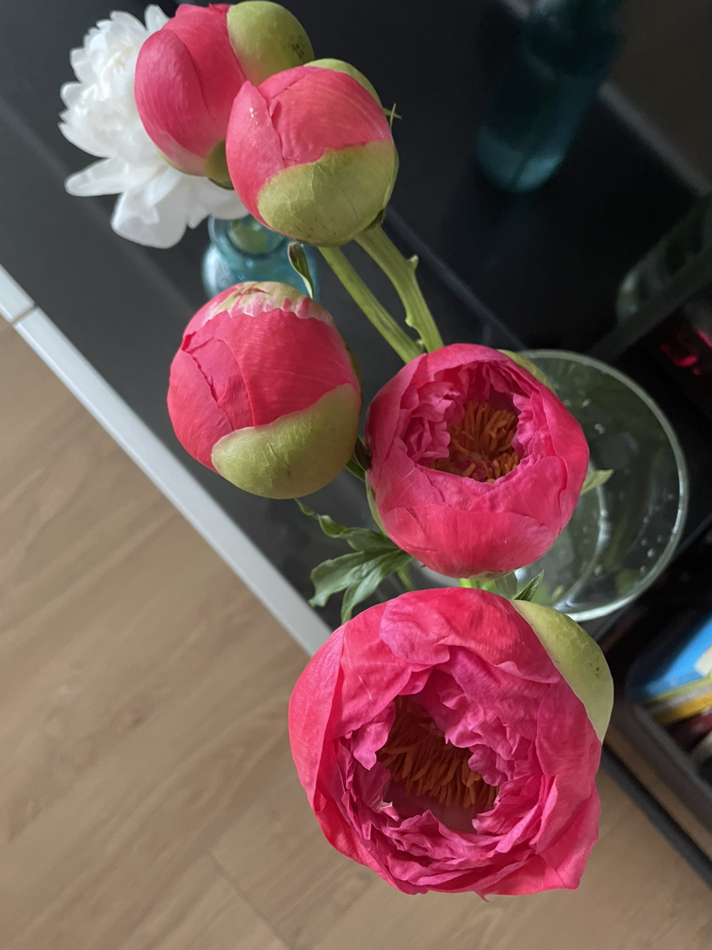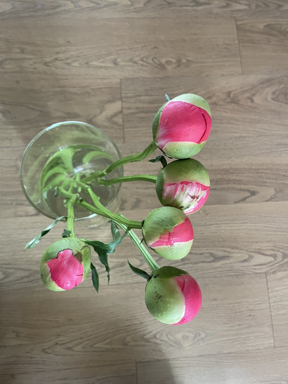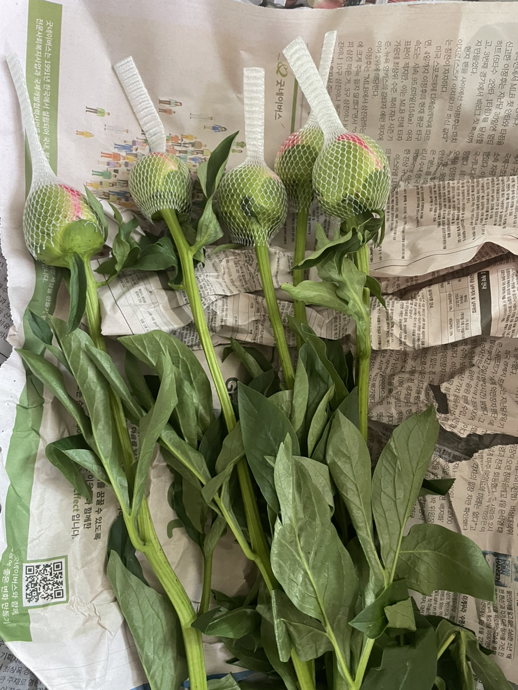 5월에는 작약을 사야지, 다들 나에게 작약을 선물해 주라 소리치고는 받았습니다. 연분홍 작약은 참 예뻤어요. 그게 시들자마자 코랄 빛 작약을 주문했습니다. 동네 화원에는 없다 해서 인터넷 주문을요. 온다는 날, 왔다는 문자, 집에는 아무도 없는데 박스 속에서 시들어 죽는 건 아닌지 불안불안, 뛰어갔지요. 대형박스 속에 신문지 겹이불 속에 망사 커버를 쓴 봉오리는 다섯 개. 거의 알처럼 보이네요. 화병에 물을 담고 줄기를 비스듬히 자르고 꽂는데 조금씩 벌어져요. 보고 있는 중에도 벌어지는 게 느껴져요.