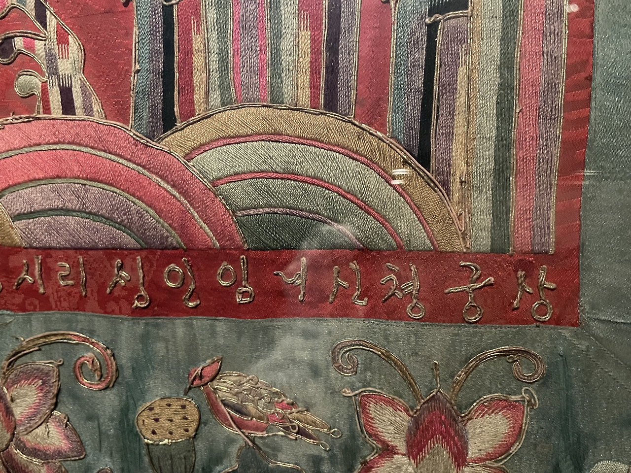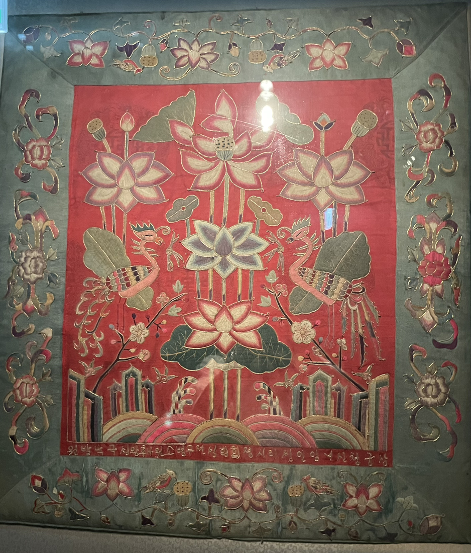 아름다운 방석을 보았습니다. 붉고 크고 빛나는 영원 같았습니다. 방석 아래쪽에 '상궁 청신녀 임인생 리씨정희행 생전무병소원 사후왕생 극락발원'이라는 문장을 수놓았고요. 발원자는 임인년에 태어나고 '정희행'이라는 법명을 가진 불교 신자입니다. 상궁으로, 건강하게 살다가 극락에 가기를 기원하는 염원을 담았습니다. 가운데 빨간색 직물에는 삼산, 물결, 파도, 연꽃, 영지 모양의 불로초, 봉황 등을 수놓았어요.