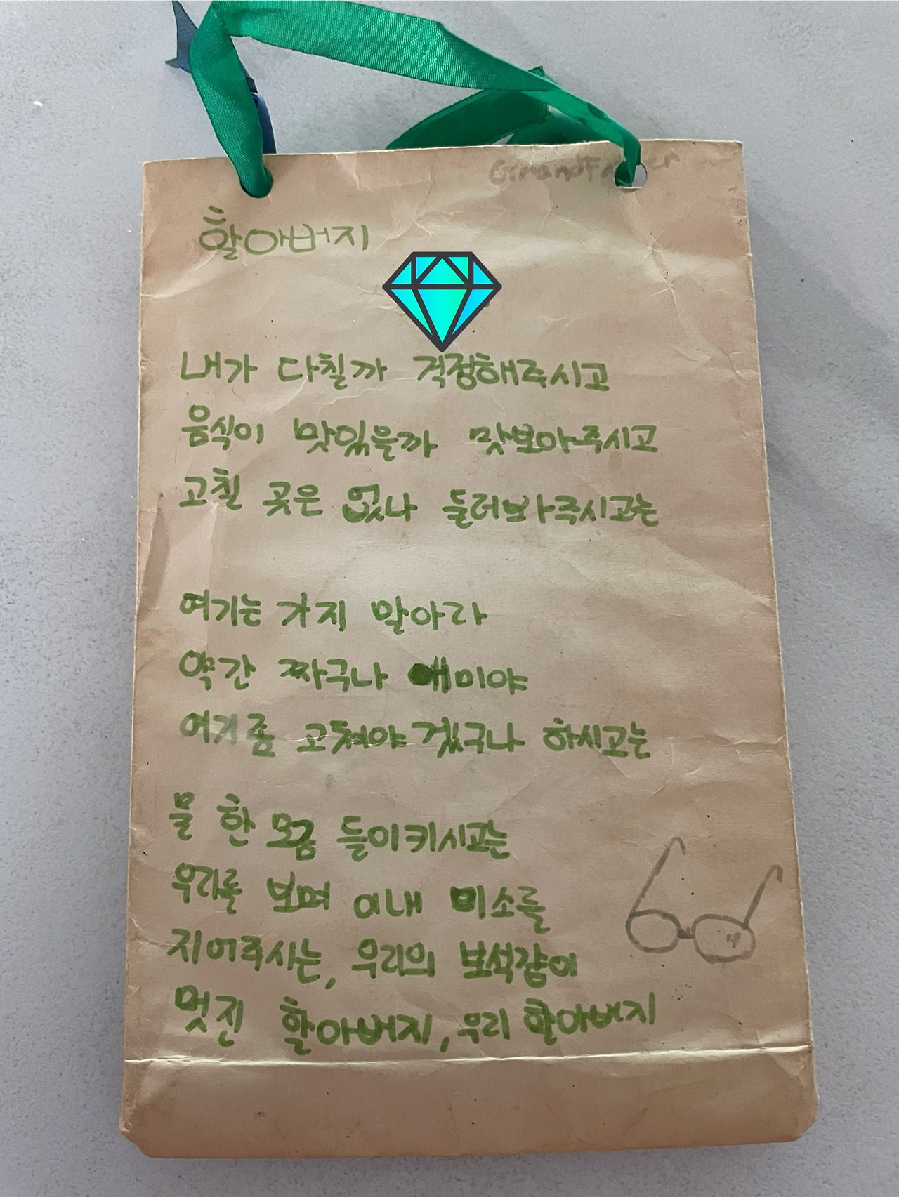 아버지 집 장식장에서 큰 아이가 유치원 때 드렸던 편지를 찾았다. 누렇게 변했지만 초록 손잡이 매단 가방에 초록 글씨. 종이가방 속에는 만든 꽃이 들어있다.
